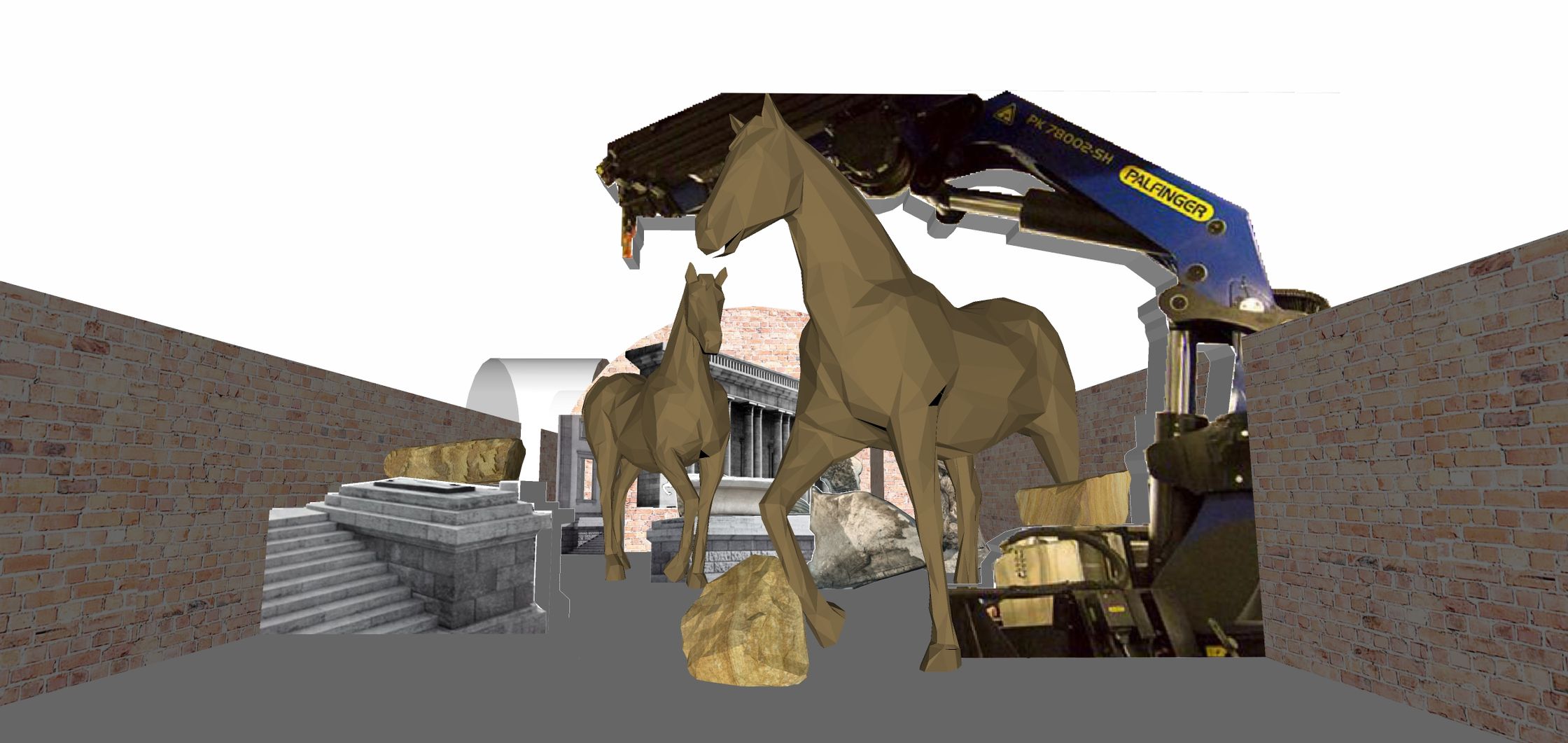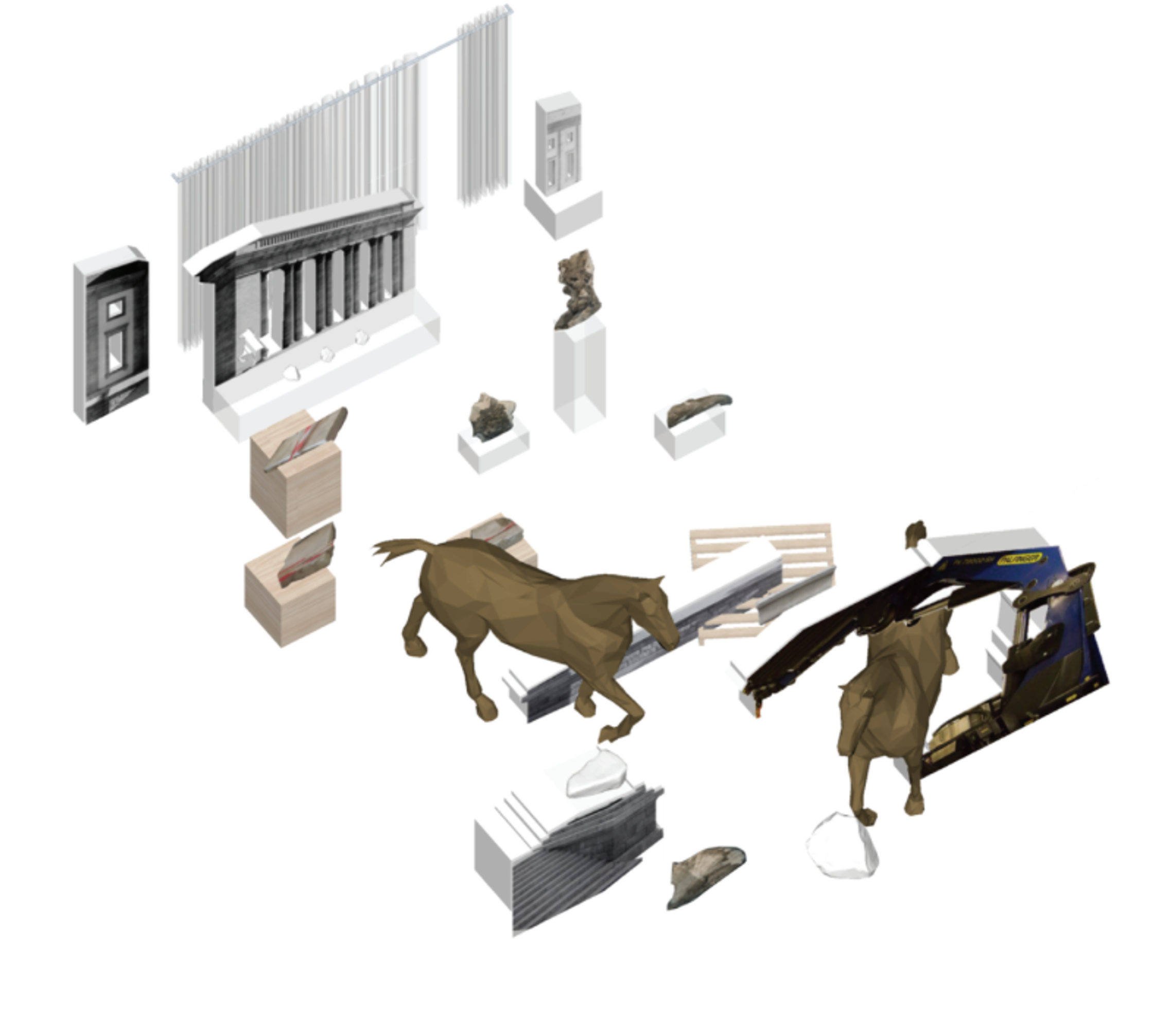 Spatial concept proposal addressing the presentation of recovered Nazi-era sculptures through an archaeological narrative. The project explored layered environments combining historical fragments, printed architectural references and industrial elements, leading visitors through a sequence of spaces focused on material contrast, circulation and sensory pacing.