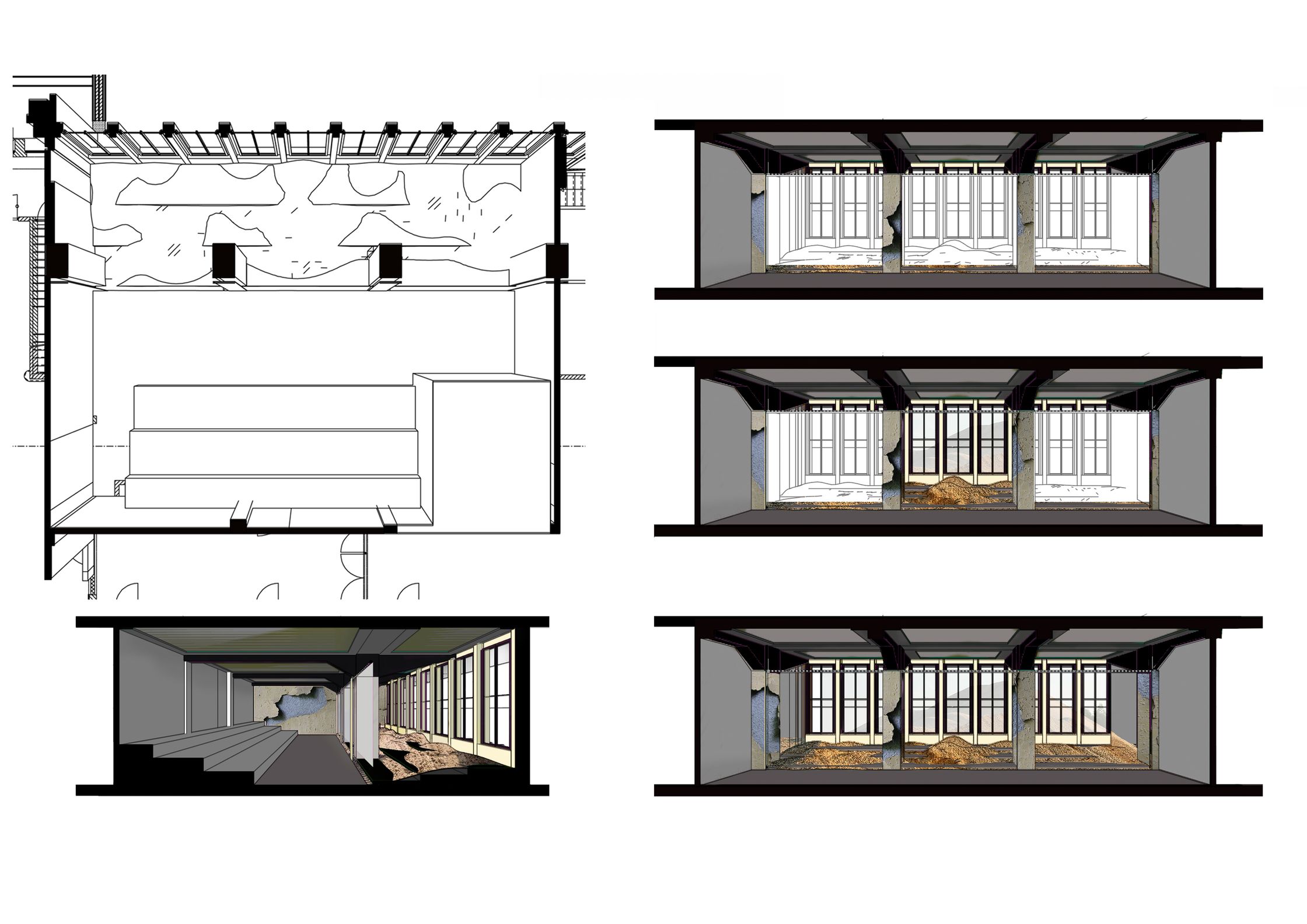Architectural plan and section drawings developed as part of the Bühnenbild proposal, exploring spatial dramaturgy and circulation as narrative tools.